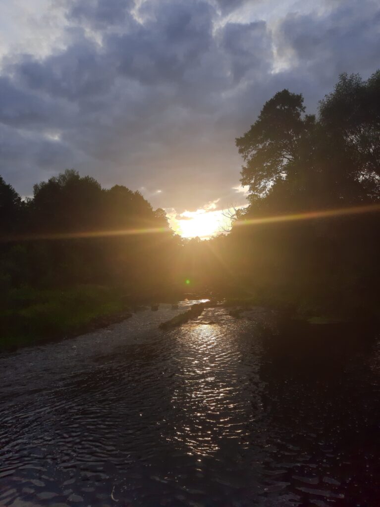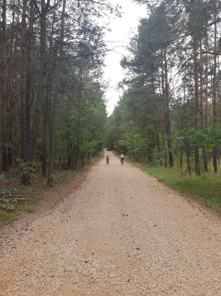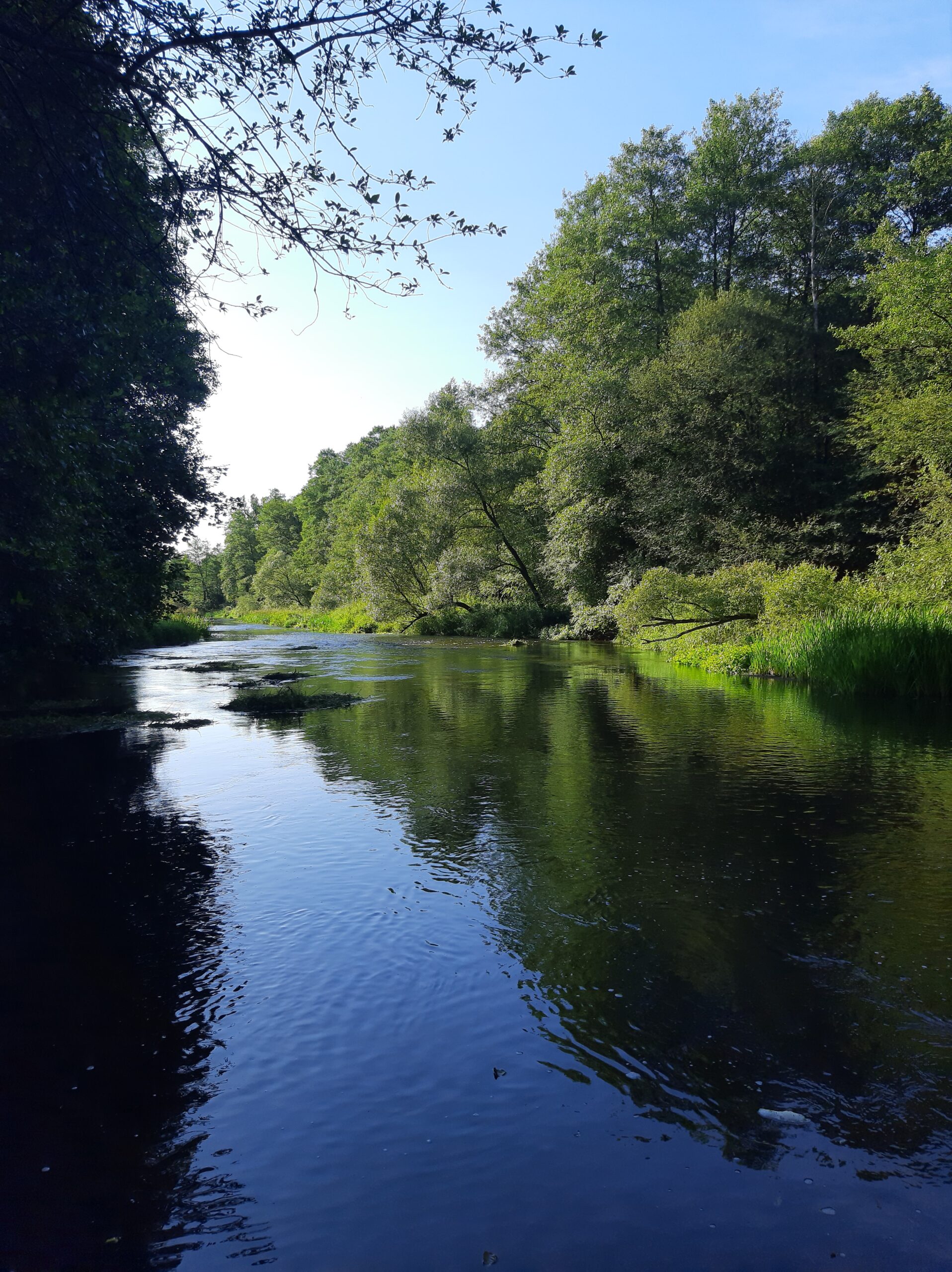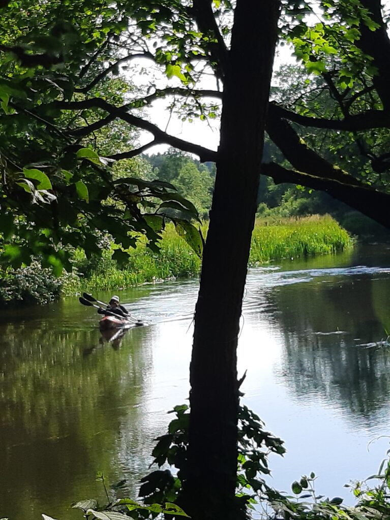 Domek w koronach drzew otoczony lasem sosnowo modrzewiowym z widokiem na rzekę Liswarta